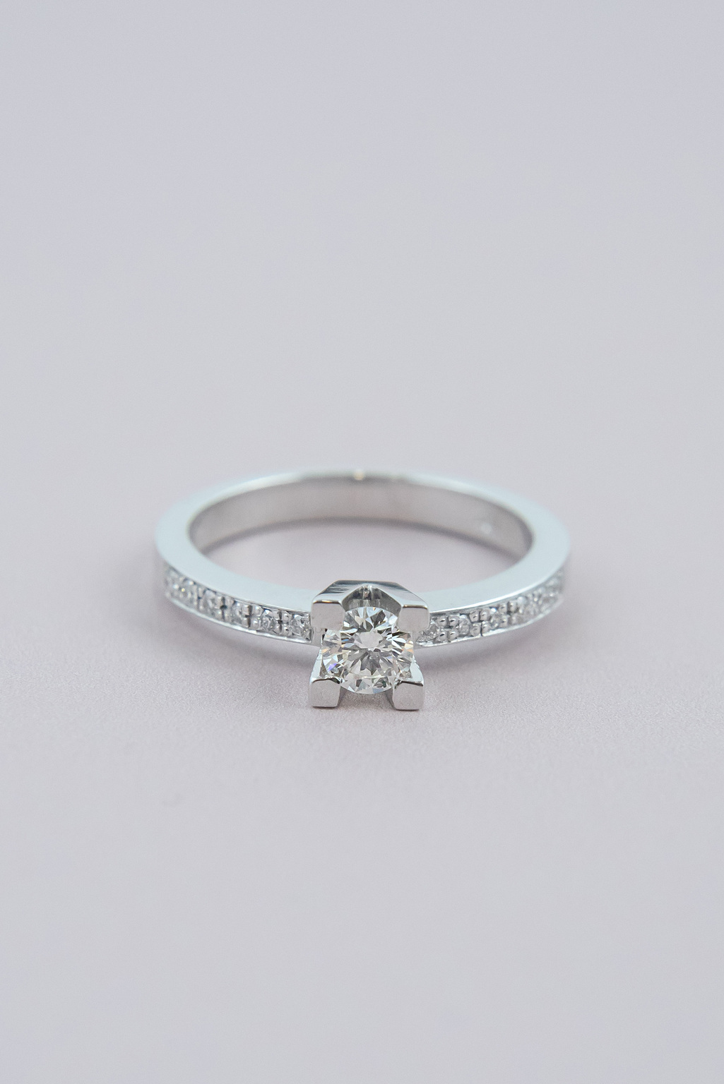 Single stone ring 18ct white gold with precious stone diamond in a classic tie in the center and small diamonds to the right and left of it. For more information please contact us.