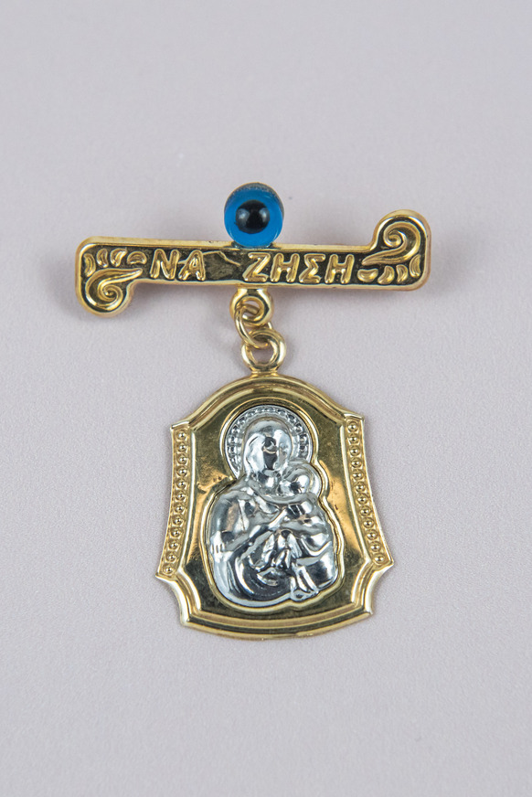 Παιδικό φυλαχτό δίχρωμο λευκό και κίτρινο με απεικόνιση την Παναγία με τον Ιησού.