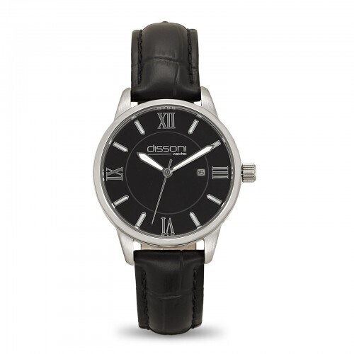 Ένα ρολόι με δερμάτινο μαύρο λουράκι και μαύρο καντράν για όλες τις ώρες το οποίο φοριέται και από τα δύο φύλλα με ασημί λεπτομέρειες.
